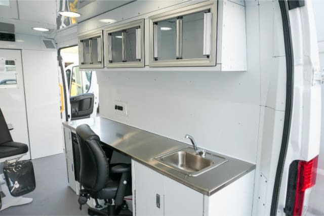 Initiatives that work to end homelessness need a way to address their client’s needs right where they are. Vans equipped with a private space give these programs a safe working environment in underserved places. Social workers can have an on-demand treatment space, with supplies and personnel to best serve their clients.