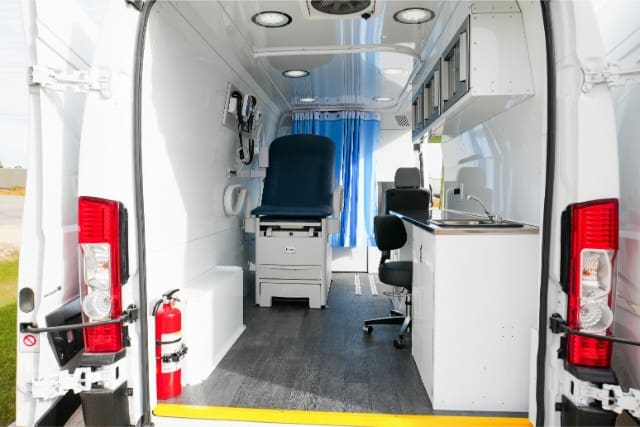 Mobile medical vans offer a medical space for non-urgent medical needs. Services such as bloodwork, physical exams, first aid, and stretcher transportation are all possible in a custom mobile medical van.