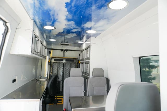 | Overhead storage | Keeps extra supplies like blankets, toiletries, and non-perishable snacks available for distribution on the go. |